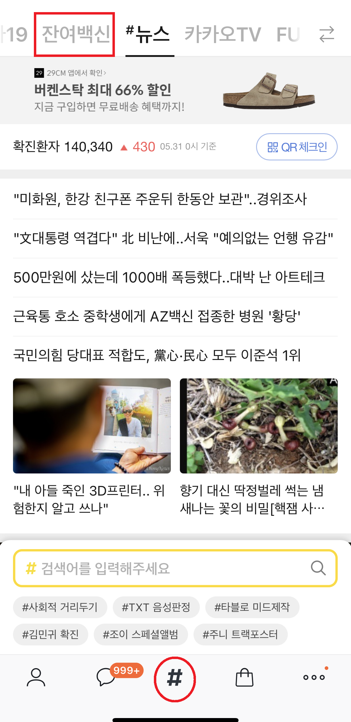 카카오톡 접속하신 후에 하단 #을 클릭 하신 후 상단 '잔여백신' 탭을 눌러 줍니다.