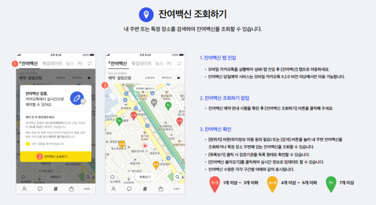 네이버 / 네이버지도 / 카카오톡 / 카카오맵 등의 어플을 통해서 '잔여백신' 혹은 '노쇼백신'이라고 검색을 하면 현재 접종이 가능한 인근 기관의 위치와 백신의 잔여 수량을 확인할 수 있습니다.