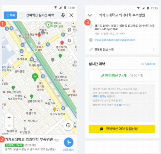 1) 지도에서 잔여백신이 있는 접종기관을 선택하면 상세페이지로 이동