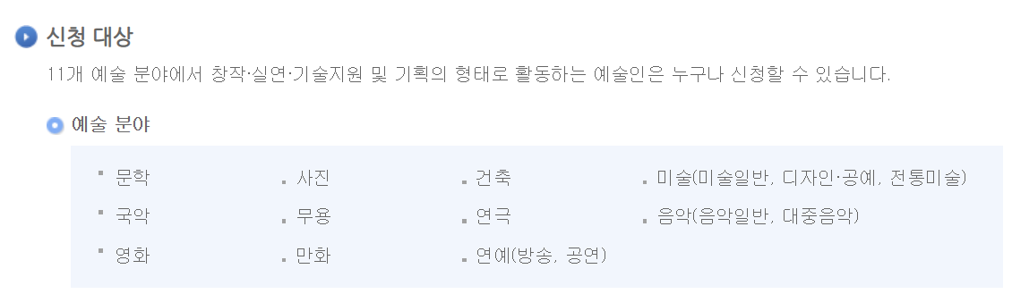예술 활동증명서라는 예술업에 종사하고 있다는 것을 나타낼 수 있는 일종의 라이센스로 문학 / 사진 / 건축 / 미술 / 국악/ 무용 / 연극 / 음악 / 영화 / 만화 / 연예 등 11개 예술 분야에서 활동하고 있는 예술인은 누구나 증명서 신청이 가능합니다.
