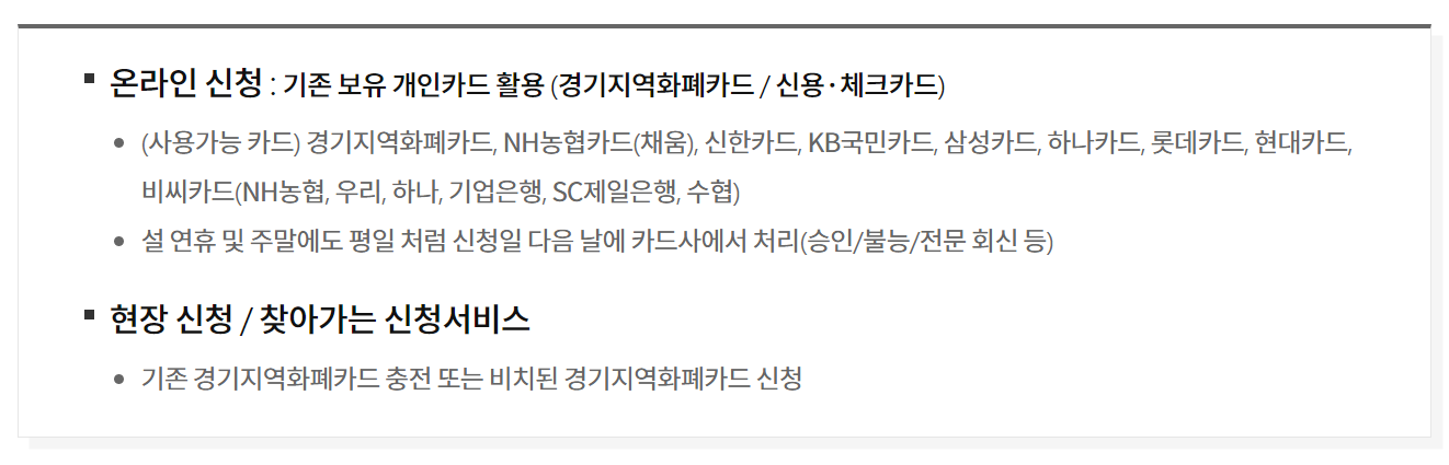 기존에 사용하던 경기지역화폐카드나 시중 13개 카드사 중 현재 사용하고 계신 카드사 하나를 선택해 온라인으로 재난지원금을 신청하시면 됩니다.