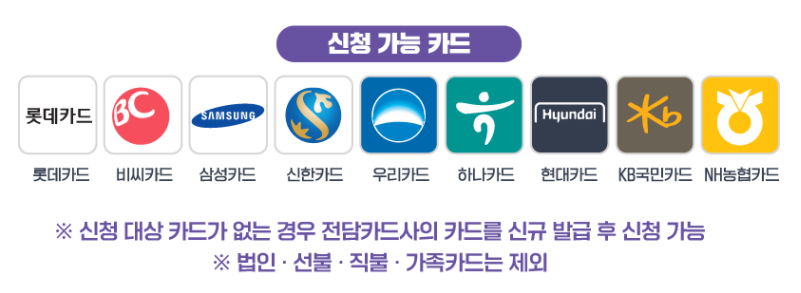 상생소비지원금 신청 전담 기관은 롯데, 비씨, 삼성, 신한, 우리, 하나, 현대, KB국민, NH농협카드사입니다.