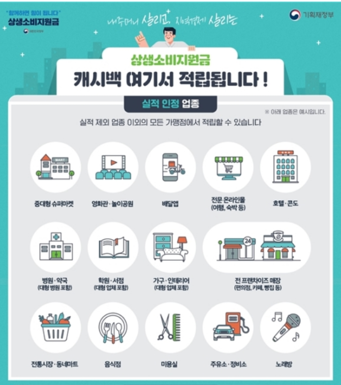얼마 전 지급 된 상생국민지원금 사용처(가맹점)는 거의 대부분 해당되는데요, 여기에 추가로 중대형 슈퍼마켓, 영화관, 배달앱, 전문온라인몰, 공연, 대형 병원·서점·학원, 프랜차이즈 직영점 등도 사용 실적이 인정됩니다.
