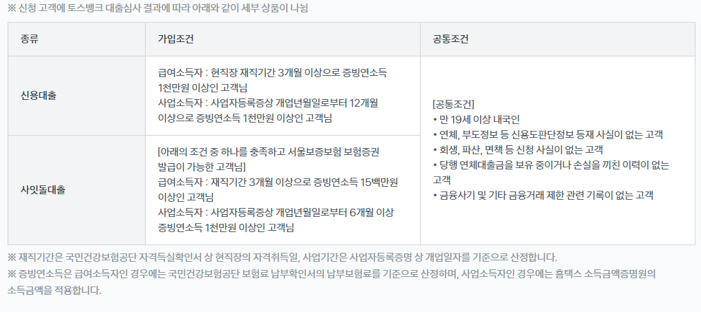 토스뱅크의 신용대출은 크게 일반 신용대출과 사잇돌대출로 구분되는데요, 일반 대출의 경우 현직장에서 재직기간 3개월 이상으로 증빙연소득 1천만원 이상인 경우 누구나 가능합니다.