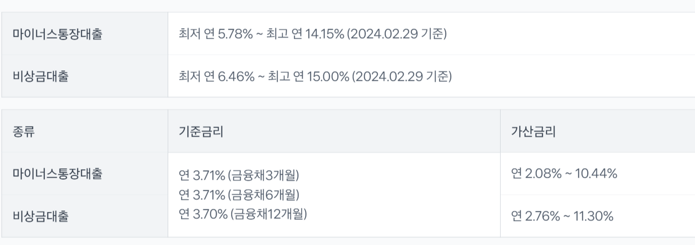 2024년 3월 기준 비상금대출의 금리는 연 6.46%~, 마이너스 통장 대출 금리는 연 5.7% 부터 시작합니다.