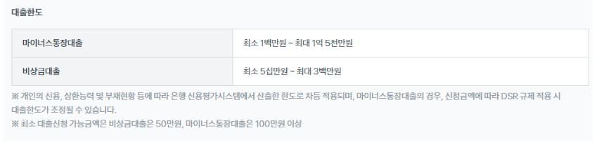비상금대출의 경우 최대 3백만원 까지 가능하고, 마이너스 통장은 최대 1억 5천까지 받을 수 있습니다.