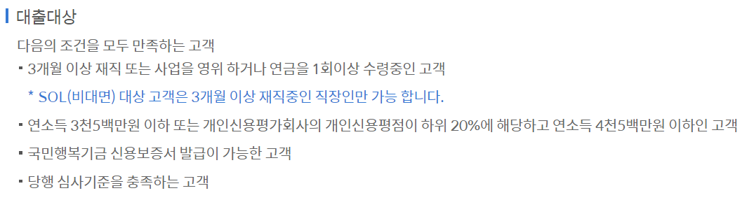 연소득 4천 5백만원 이하이면서 개인신용평점 하위 20% 이하 또는 연소득 3천 5백만원 이하인 고객으로 직업 및 소득이 있으며 국민행복기금의 신용보증서 발급이 가능한 만 19세 이상인 고객