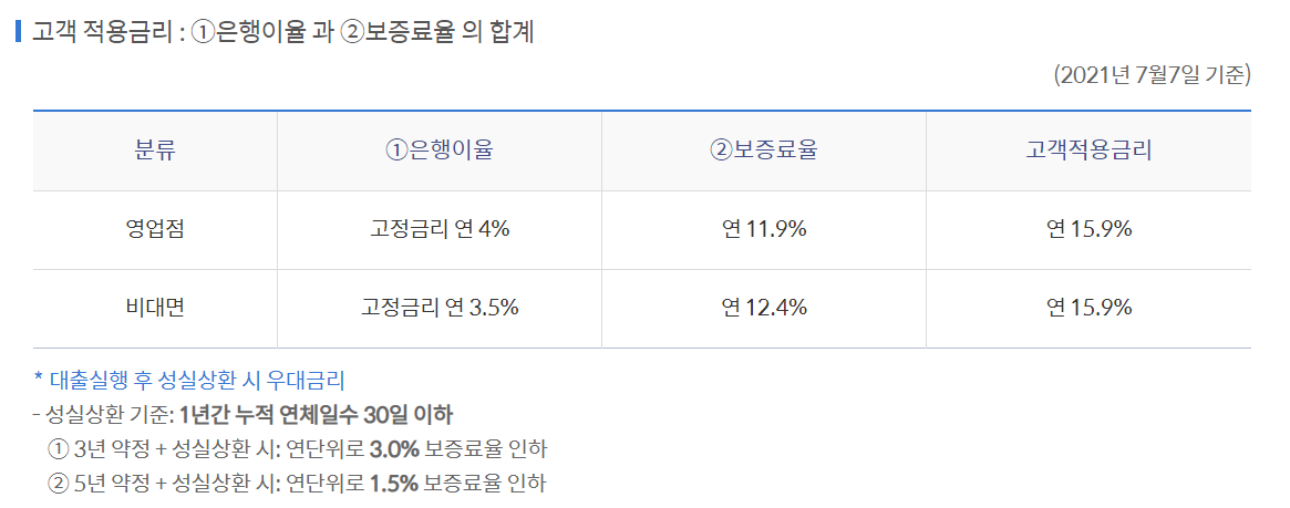 • 고객적용금리: 연 15.9% 단일금리 (보증방식에 따라 세부 확정금리/보증료율은 다르나, 총 고객적용금리는 동일)