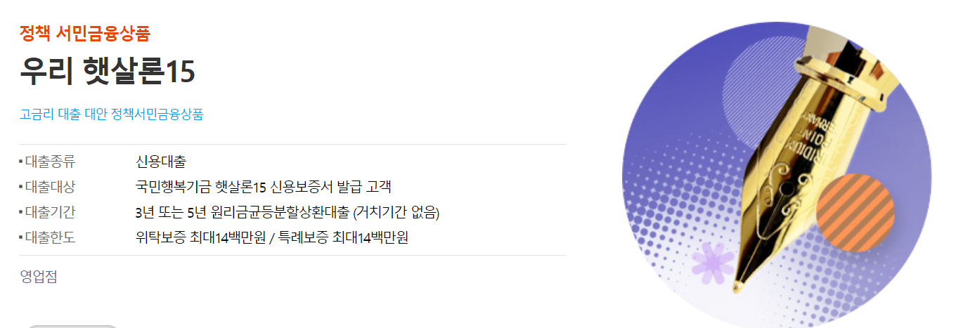 우리 햇살론 15는 제도권 금융기관에서 대출이 거절되어 대부업·불법사금융 이용이 불가피한 분들을 지원하기 위한 정책서민금융상품으로 보통 대환대출로 많이 이용하시는 상품입니다.