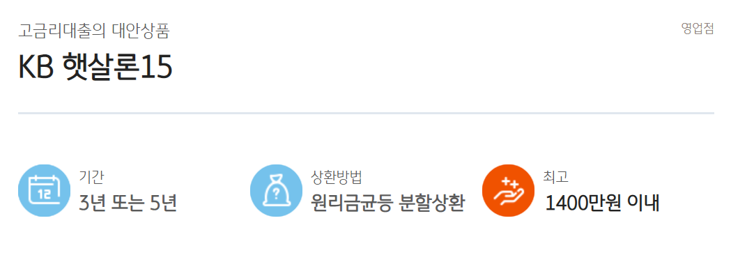 : KB국민은행의 햇살론 15대출 상품은 햇살론 17에서 금리가 변경된 상품으로 국민은행의 대표적인 대환대출 상품입니다.