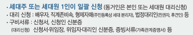 신청 방법은 세대별 세대주 또는 세대원 1인이 필요서류와 신분증을 지참해서 신청하시면 됩니다.