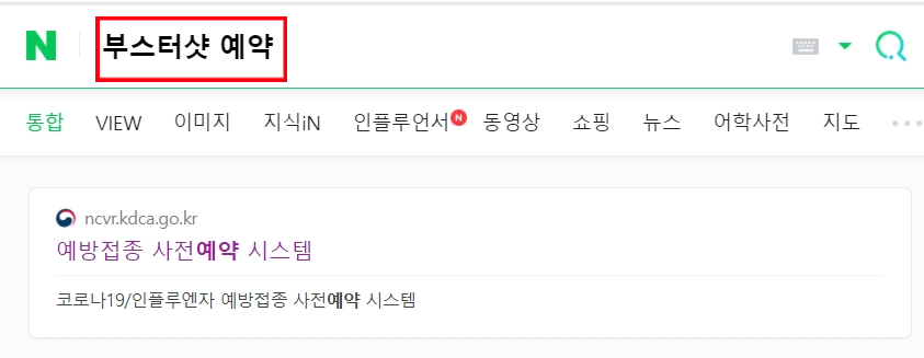 1) 네이버에 '부스터샷 예약'을 검색하시고 '예방접종 사전예약 시스템(ncvr.kdca.go.kr)'에 접속합니다.