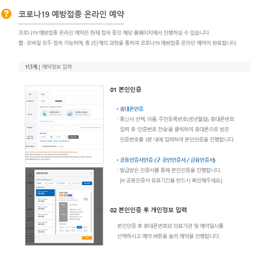 3) 이후 스마트폰 혹은 공동인증서를 통해 본인인증과 예약자(대리 예약자)의 간단한 기입 정보, 백신 접종을 희망하는 의료기관을 선택하면 예약이 완료됩니다.