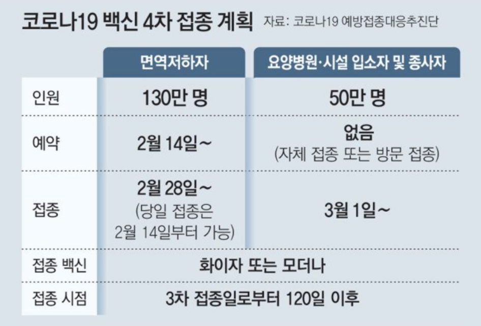 면역저하자 130만 명이 첫 대상자이고, 다음으로는 요양병원·시설 입소자 및 종사자 등 감염취약시설과 관련되어 있는 약 50만 명이 3월 1일부터 4차 접종을 시작합니다.