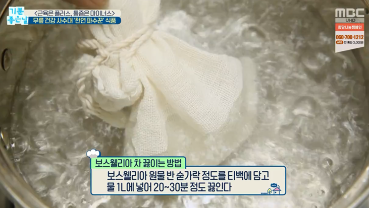 보스웰리아를 먹는 방법은 요즘은 알약 형태로도 나오지만 보스웰리아 가루를 이용해서 보통 차로 많이 끓여드시는데요, 보스웰리아를 잘못 끓이게 되면 주전자에 눌러 붙는 등 낭패를 볼 수 있으니 끓이는 방법을 숙지하셔야 합니다. 보스웰리아 5g~10g을 물 1.5L 에 넣고 끓이면 되는데, 끓일 때는 부직포에 보스웰리아를 넣어 끓여주어야 주전자에 눌러 붙지 않습니다. 처음에 강한 불로 끓이다가 약한 불로 줄여 30분 정도를 끓여줍니다.