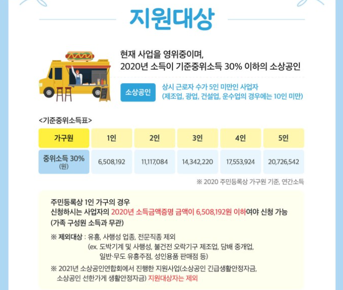소상공인 희망회복자금 지급 대상은 전국의 소상공인으로 현재 사업을 유지하고 있으면서 2020년 소득이 기준 중위소득 30% 이하인 사업자입니다.