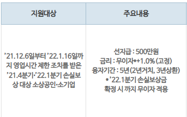 또한 이번 선지급 대상인 55만개사 이외에 ①새롭게 손실보상 대상이 되는 ‘시설 인원제한 업체’와 ②’22년 1월에 영업시간 제한을 이행하여 손실보상 대상으로 추가 확인되는 업체(2월 중순 공지 예정)는 ’22년 2월말에 1분기 선지급금 250만원을 신청할 수 있습니다.
