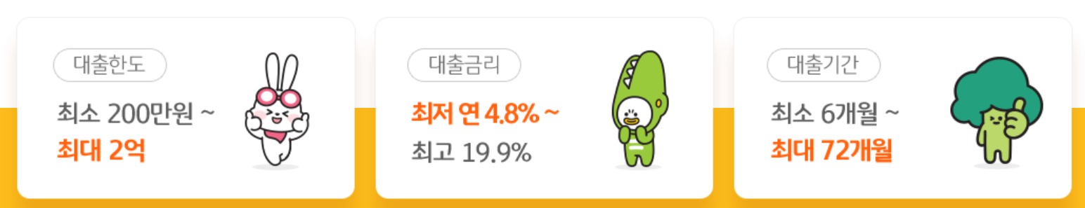 : 최저 200만원 부터 최대 2억원 까지 대출 가능하고, 금리는 고객 개인신용평점에 따라 4.8% ~ 19.9% 차등 적용 됩니다.