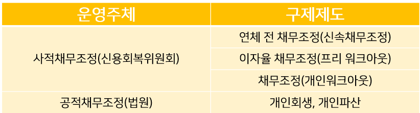 현재 우리나라에서는 신용회복위원회가 주도하는 사적채무조정과 법원이 지원하는 공적채무조정으로 나누어 채무자들을 지원하고 있습니다.