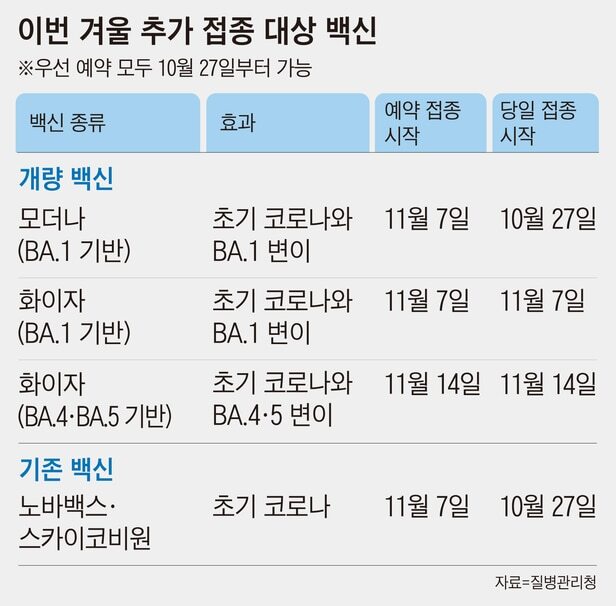 모더나 BA.1 백신은 27일부터 당일접종, 내달 7일부터 예약접종이 가능하고, 화이자 BA.1 백신과 BA.4/5 백신은 각각 내달 7일과 14일부터 접종할 수 있습니다.