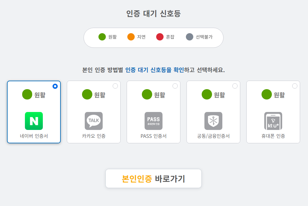 2) 사이트에 접속하면 아래와 같은 화면이 뜨게 되는데 네이버 / 카카오 / PASS / 공등,금융인증서 / 휴대폰 인증서 중 본인이 평소 자주 사용하는 인증 매체를 선택하시면 됩니다.