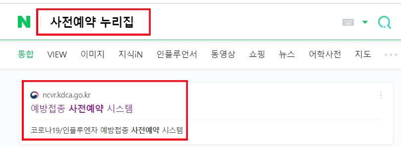 1) 네이버에 '사전예약 누리집'을 검색하시고 '예방접종 사전예약 시스템(ncvr.kdca.go.kr)'에 접속합니다.