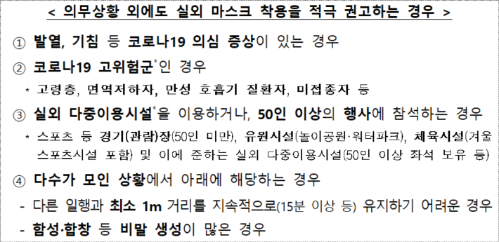 단 발열, 기침 등 코로나 19 의심 증상이 있는 경우와, 코로나19 고위험군인 경우(고령층, 면역저하자, 만성 호흡기 질환자, 미접종자 등) 안전을 위해 의무상황 외에도 실외 마스크 착용을 적극 권고하고 있으니 이 점 참고하시기 바랍니다.