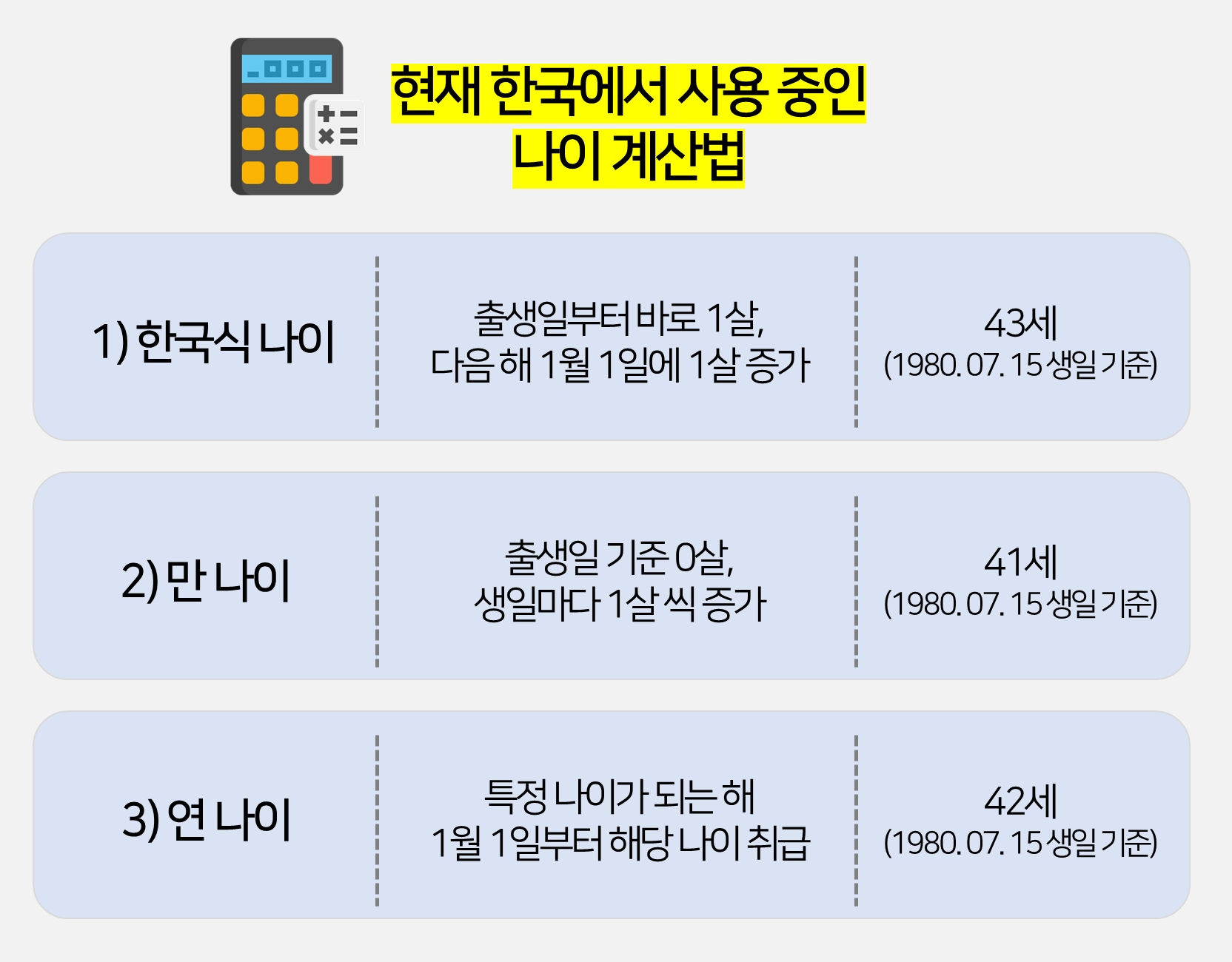 현재 우리나라에서 사용되는 나이 계산법은 1) 한국식 나이 2) 만 나이 3) 연 나이 3가지가 있습니다.