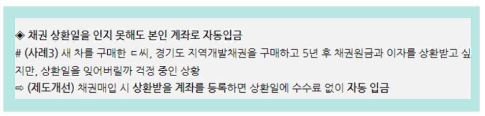 또한 2022년 3월부터 신규 채권을 매입할 경우, 채권 보유사실을 잊더라도 만기 도래시 환급금 신청 계좌로 자동입금 됩니다.