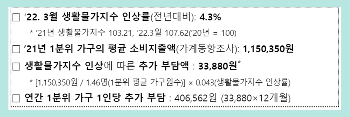 * 생계·의료 1인 기준 40만 원은 ‘21년 1분위 가구의 평균 소비지출액을 기준으로 생활물가지수 인상에 따른 추가 부담액을 고려하여 산출