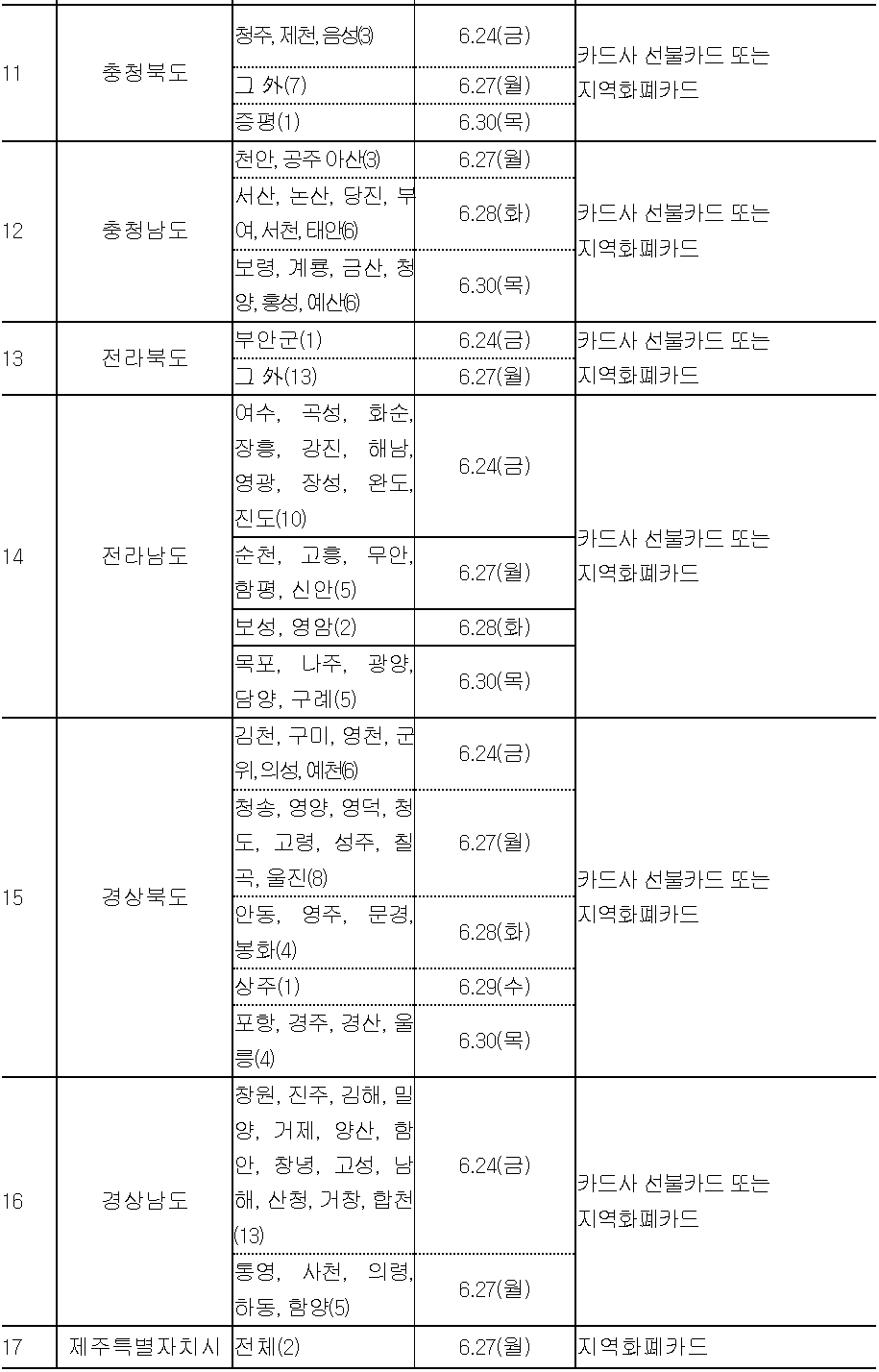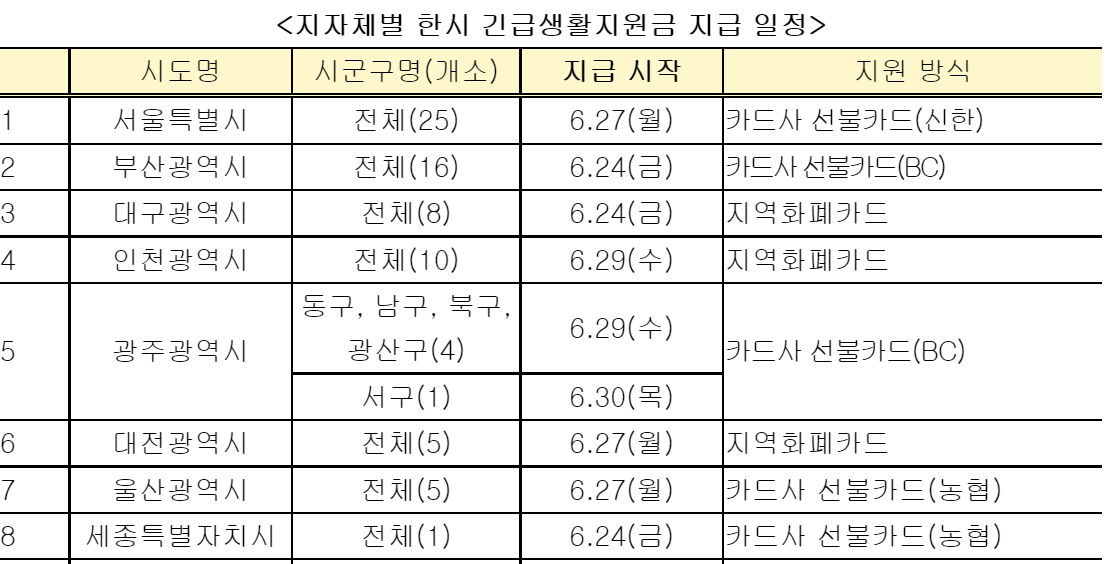 부산, 대구, 세종 등은 6월 24일(금) 지급을 최초로 시작하며 서울, 대전, 울산, 제주는 6월 27일(월)부터 지급하는 등 나머지 지역도 모두 6월 중으로 지원이 시작됩니다.