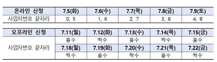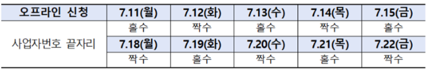온라인 신청은 7. 5 ~ 7. 9일 까지 첫 5일간 사업자등록번호 끝자리를 기준으로 5부제 신청을 받고, 오프라인 신청은 11일(월)부터 22일(금)까지 10일간 홀짝제로 운영합니다.