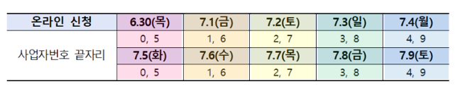 신청일 첫 날부터 10일 동안은 사이트 혼선을 막기 위해 사업자등록번호 끝자리를 기준으로 기존과 같이 '5부제'로 시행됩니다.