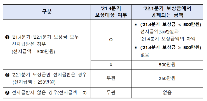 눈 여겨 볼 점은 보정률은 작년 4분기 지급 때는 90%였지만, 이번 1분기 때부터는 100%로 조정되었고, 분기별 하한 지급액은 50만원에서 100만원으로 상향됐습니다.