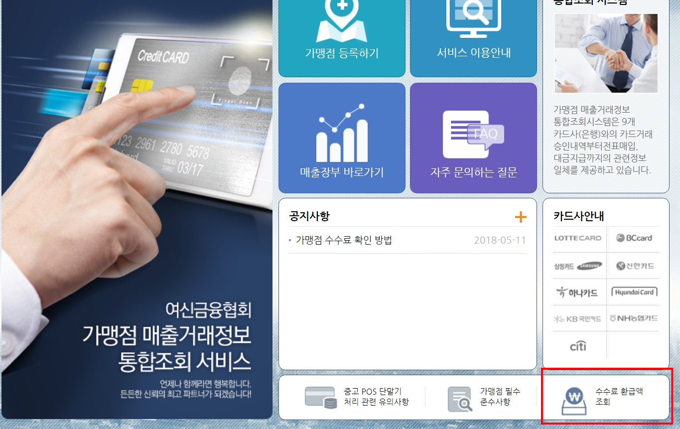 여신금융협회 홈페이지의 경우 접속하신 후에 우측 하단을 보면 '수수료 환급액 조회'란이 있습니다.