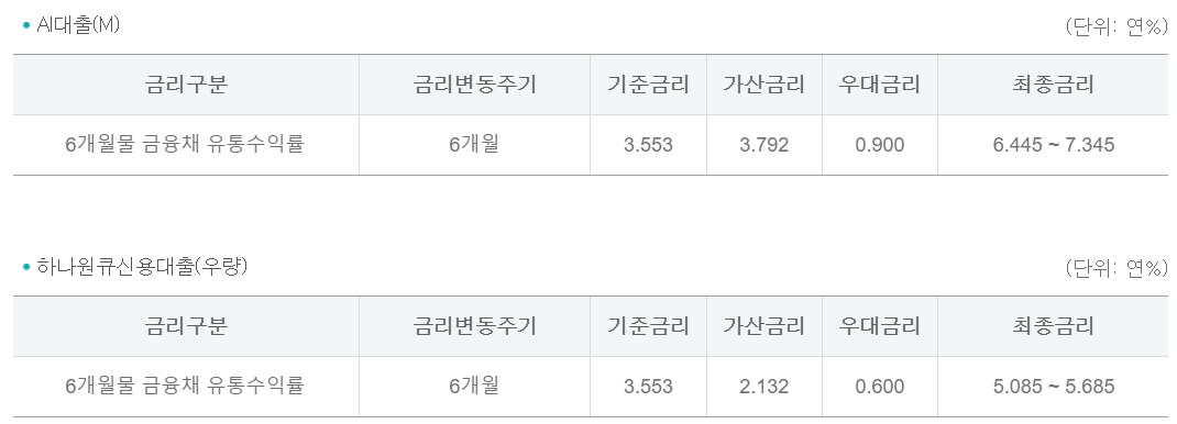 2023년 5월자 하나은행 신용대출 금리는 아래와 같습니다.