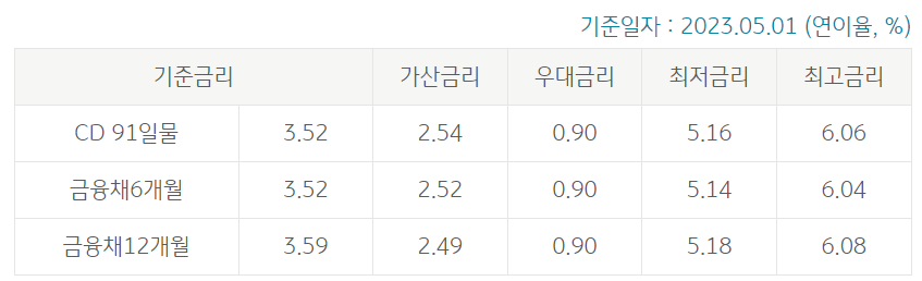 2023년 5월자 대출 금리는 다음과 같습니다.