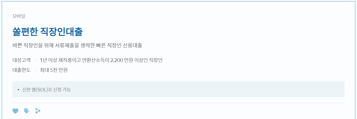 참고로 신한은행에서 지정한 기업에 재직중이신 분들은 우대 금리 및 한도를 적용 받을 수 있는 '쏠편한 직장인대출S'을 이용하실 수 있습니다.