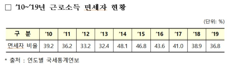 즉 우리나라에서 소득활동을 하는 전체 국민 중 1/3 이상이 세금을 내고있지 않다는 이야기입니다.