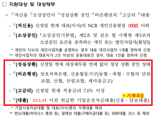 사업을 정상 영위 중인 개인사업자의 최초 취급시점이 코로나19 시기인 2020년 1월 1일부터 2023년 5월 31일까지며, 대환 신청 시점에 금리가 7% 이상인 신용대출과 카드론입니다.