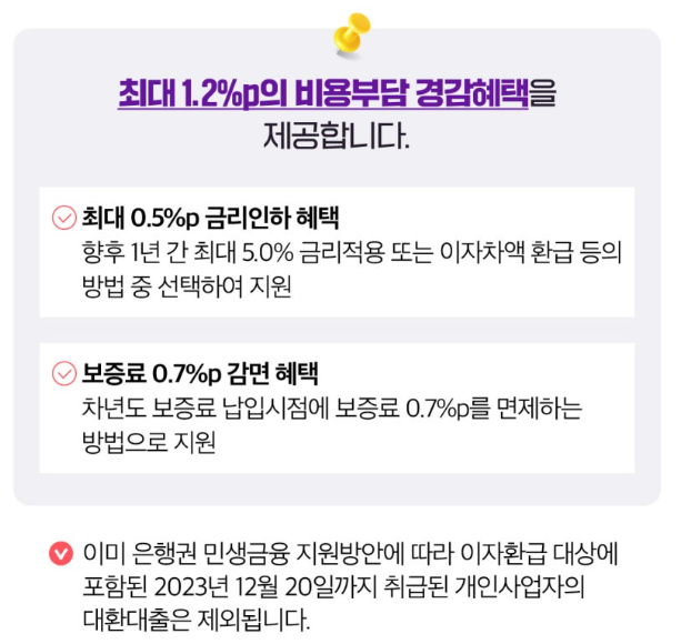 이미 은행권 민생금융 지원방안에 따라 이자환급 대상에 포함된 2023년 12월 20일까지 취급된 개인사업자의 대환대출은 제외됩니다.