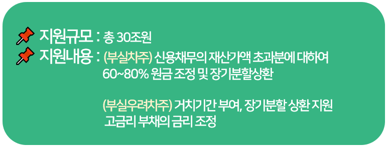 90일 이상 연체된 부실차주가 보증·신용채무의 조정을 신청한 경우, 자력으로 갚을 수 있는 수준으로 대출원금 및 대출상환일정을 조정할 수 있습니다.