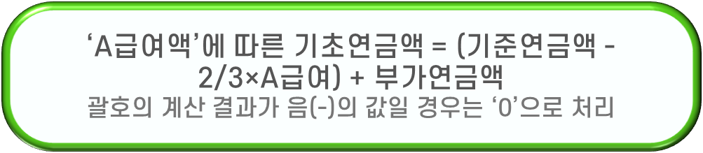 위의 경우에 해당하지 않는 분들의 기초연금액은 「소득재분배급여(A급여)에 따른 산식」 또는 「국민연금 급여액」등을 고려하여 산정됩니다.
