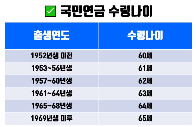 노령연금(국민연금)의 최소 가입 기간인 10년은 모든 가입자에게 동일하게 적용되지만, 연금을 받을 수 있는 나이는 출생연도에 따라 조금씩 차이가 있습니다.