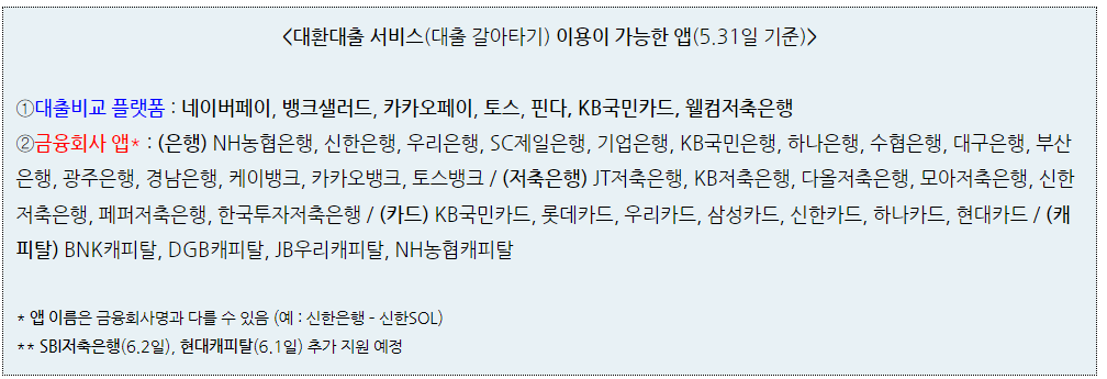 하지만 5월 31일부터 5대 시중은행(하나, 농협, 우리, 국민, 신한)과 저축은행 등 2금융권 주요 금융회사가 1개 이상의 플랫폼과 제휴하여 대환대출 상품을 공급할 예정입니다.