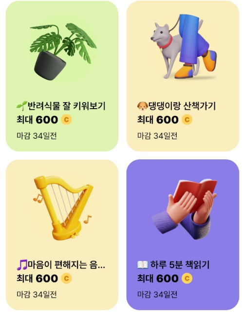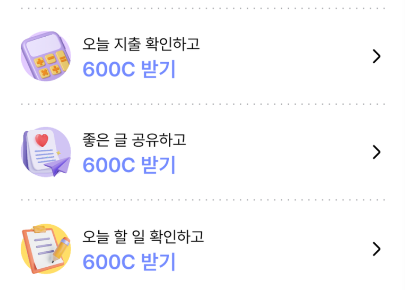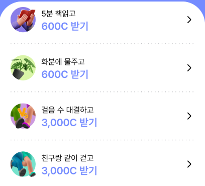 이 외에도 영양제 섭취하기, 독서하기, 공원 걷기, 음악 듣기, 화분에 물주기, 지출 내역서 확인하기 등 평소에 우리가 일상적으로 하던 행동들을 모두 돈으로 받을 수 있어, 이 점이 유사 어플과 비교해서 차별화 되는 점이 아닌가 싶습니다.