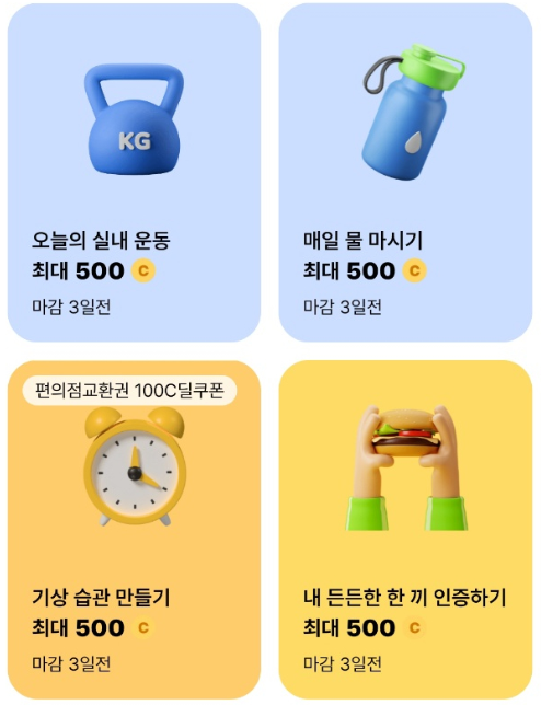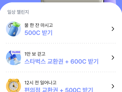 어플에 들어가면 '일상 챌린지' 라는 것이 있는데요, 물 한 잔 마시기 / 1만 보 걷고 스타벅스 교환권 받기 / 12시 전 일어낙 편의점 교환권 받기 등 다양한 미션이 있습니다.