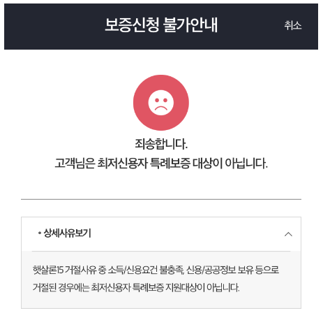 위에서 말씀드린 3가지 조건만 충족하면 웬만하면 쉽게 승인되는 상품이지만 간혹가다가 특례보증도 거절되시는 분들이 보입니다.