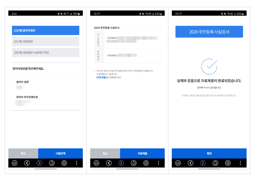비대면 조사는 조사 대상자가 본인의 거주지(주민등록지)에서 ‘정부24’앱에 접속한 후 사실조사 사항에 응답하는 방식으로 진행됩니다.