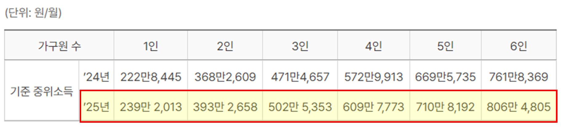 2025년에는 기준 중위소득이 각 가구원 수에 맞게 인상되었습니다. 아래는 2025년 기준 중위소득 표입니다: